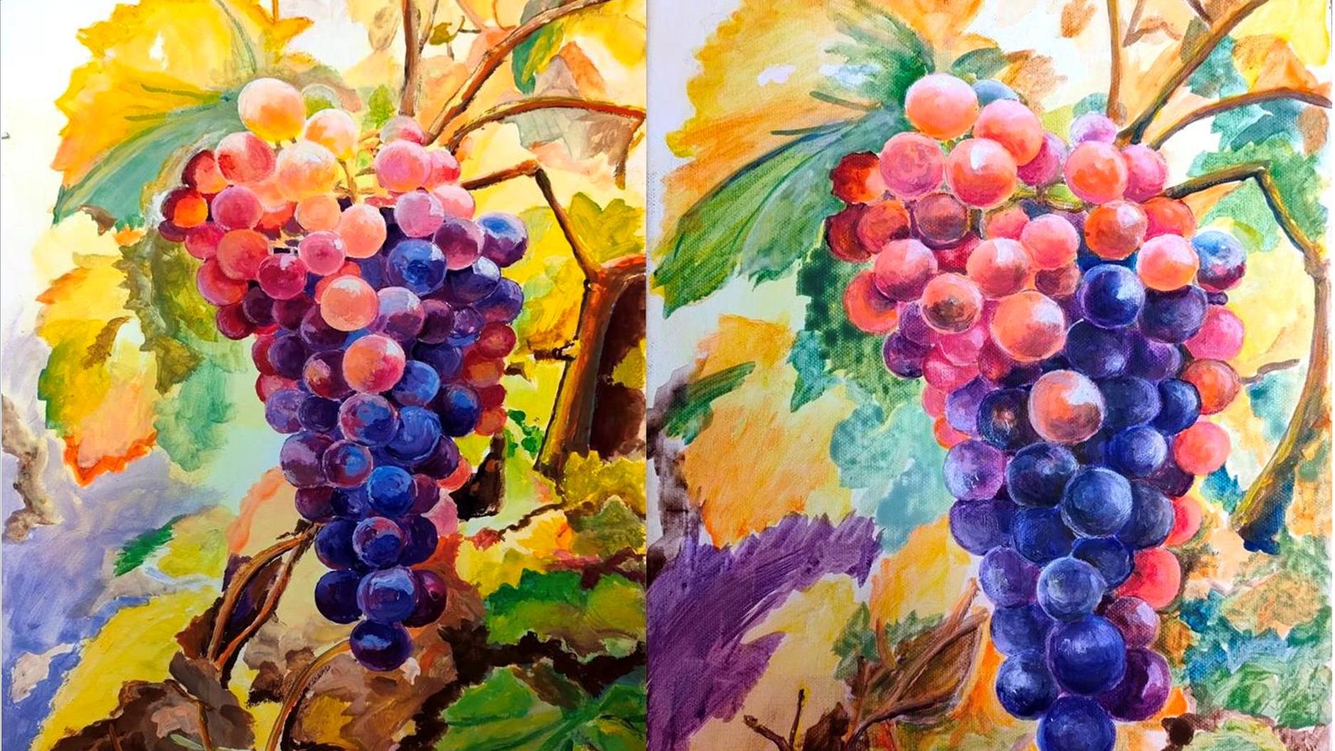 Erlebe einen kreativen Nachmittag voller Farben und Inspiration! Alle Materialien, das Motiv – eine prächtige Weintraube – und eine 30×40 cm-Leinwand werden gestellt.